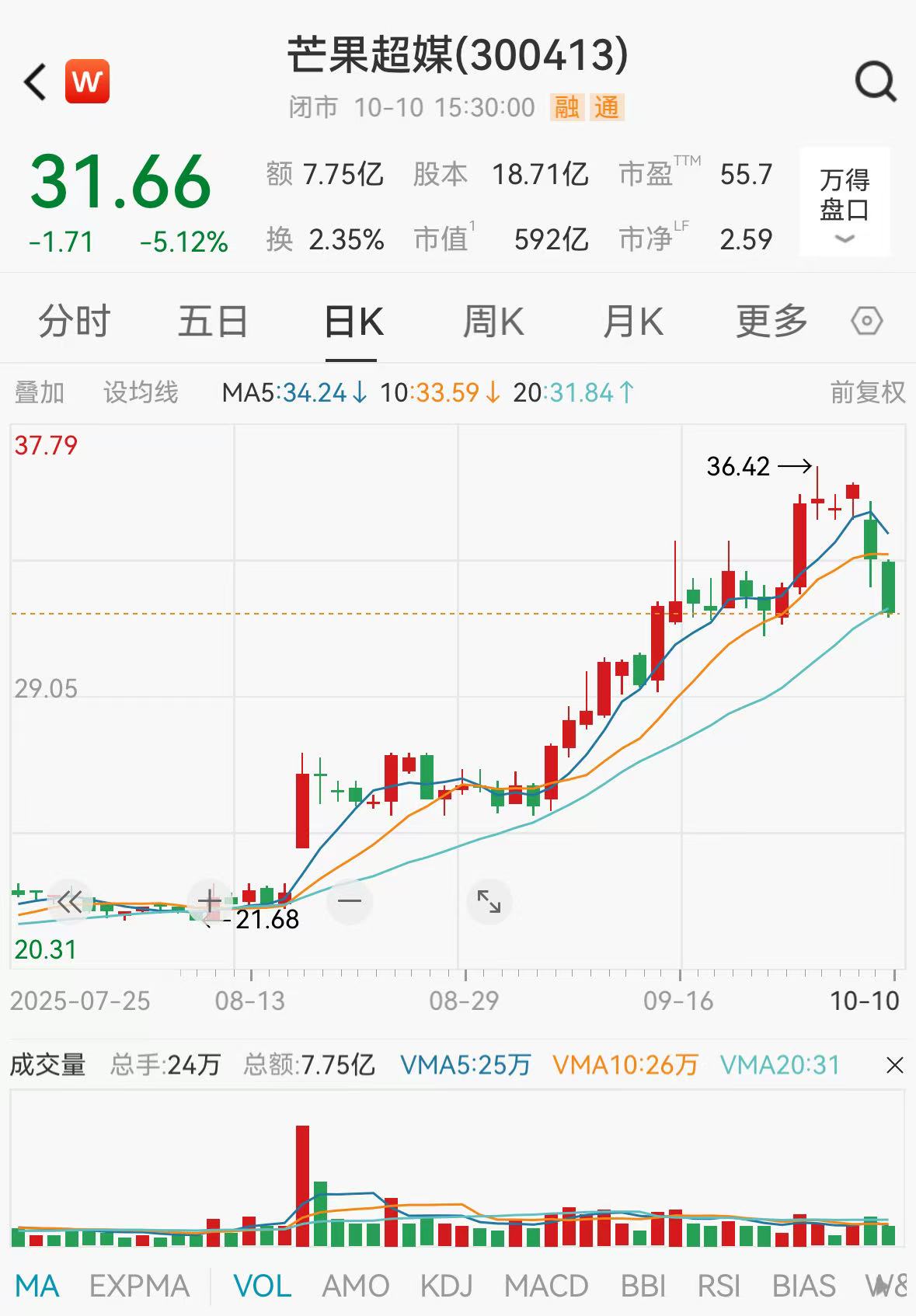 10月10日,芒果超媒股价下跌5.12%,报收31.66元/股。10月9日,芒果超媒股价下跌6.68%,两日累计跌幅超过11%,总市值蒸发约76.70亿元。