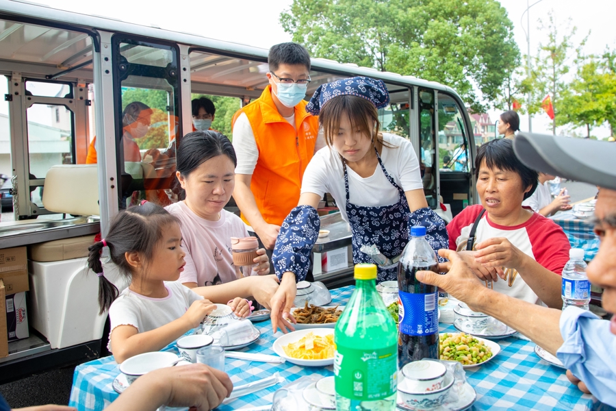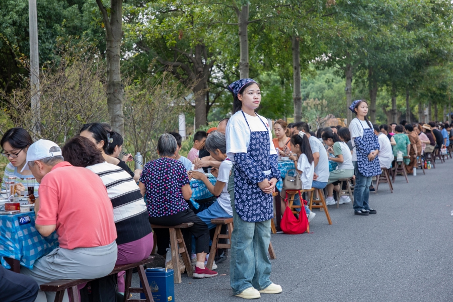 作为金山区首条“四好农村公路”,水库村长堰路当天一字排开88张八仙桌,自东向西总长约380米,沿途串联着田园风光、藕遇公园、游船码头等。桌号从8801至8888依次递进,二十四节气元素穿插其间,每一个编号都承载着独特文化意涵,游客入座便浸润在浓厚人文氛围中。