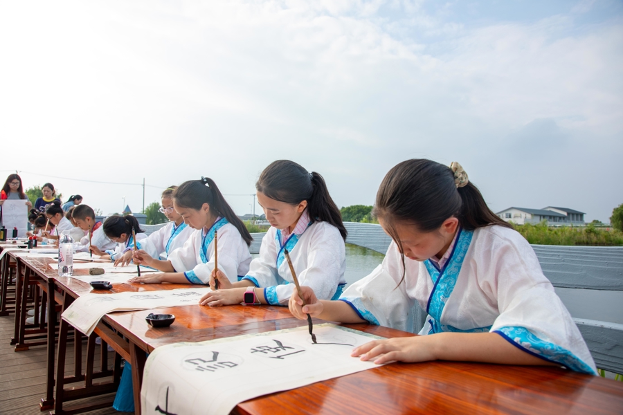 作为沪郊小有名气的“书法之乡”,漕泾自古崇文厚德,书法底蕴深厚,书法教育更贯穿于当地各大学校。走秀现场,老师带领学生在T台旁挥毫泼墨,墨香与湿地的清新气息交织相融。大学生与模特身着太极礼服、传统汉服等民族服饰登场,一举一动间尽显中华传统文化的大气与典雅。