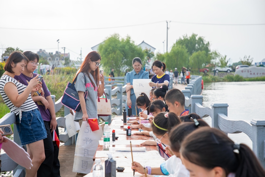 “湿地走秀”分为“水乡源起·自然馈赠”“文脉赓续·墨药承薪”“金穗丰年·喜庆盈门”三大篇章,参与者既有漕泾镇村居民,也有游客、志愿者,更有中小学及幼儿园师生、书法爱好者、盐民代表等,不同身份的参与者共同登上T台。