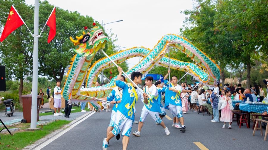 随后,“龙游长堰”舞龙表演精彩上演,长堰乡村时装秀更将气氛推向小高潮——模特身着融入漕泾本土元素的服饰,在长桌旁的临时T台上演绎乡村与时尚的碰撞。