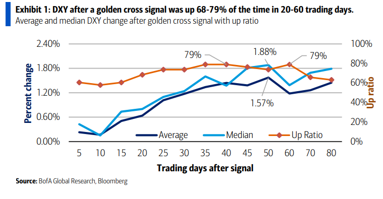 历史统计显示新玺配资,金叉出现后,美元指数的表现呈现明显的上涨倾向。自1970年以来,美元指数共出现过38次此类信号,当前为第39次。美银美林报告显示:
